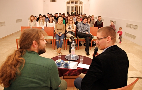 – A költészet nekem úgy jött, hogy a nővéremet akartam túllicitálni. Egyszerű rivalizálásnak indult. Később persze átestem én is a fájdalmas, meg nem értés fázison, de ez szerencsére nem tartott sokáig. Könnyed, érthető verseket akarok írni, szeretem a magyar nyelv játékosságát, kimeríthetetlen rímképeit, ebben lubickolok. Azt írom, ami foglalkoztat. Most elsősorban az apaság tölti ki az időmet, ezért gyerekverseket írok. Ennyi. Nem gondolom túl az irodalmat. Itthon nagy hagyománya van a tragikus hangvételű verseknek, sok költő szinte vátesz volt, ami egyfajta elvárás is. Mindez azonban a habitusomtól távol áll, alkatilag a könnyedebb költészet áll közel hozzám, volt, hogy egy kritikában a posztinfantilizmus előfutárának neveztek. Mindenesetre én biztos nem csinálok majd forradalmat vagy állok valaminek az élére, alapvetően visszahúzódó, gátlásos vagyok, hacsak lehet, nem megyek el otthonról – fogalmazott, a javarészt középiskolás diákok előtt tartott találkozón, a gyermeklelkű költő.
