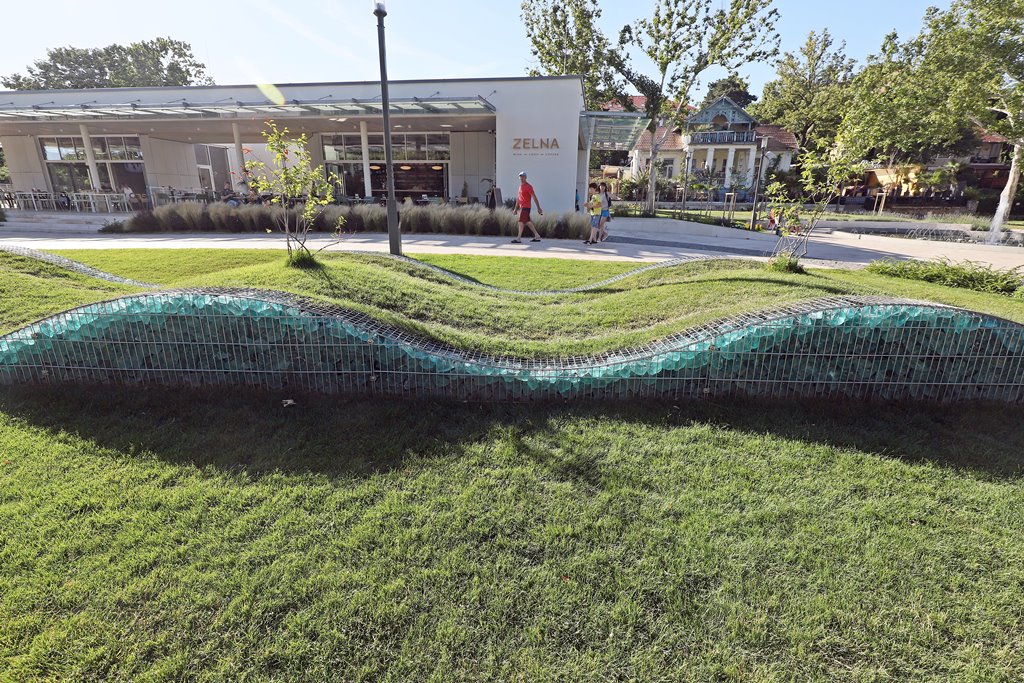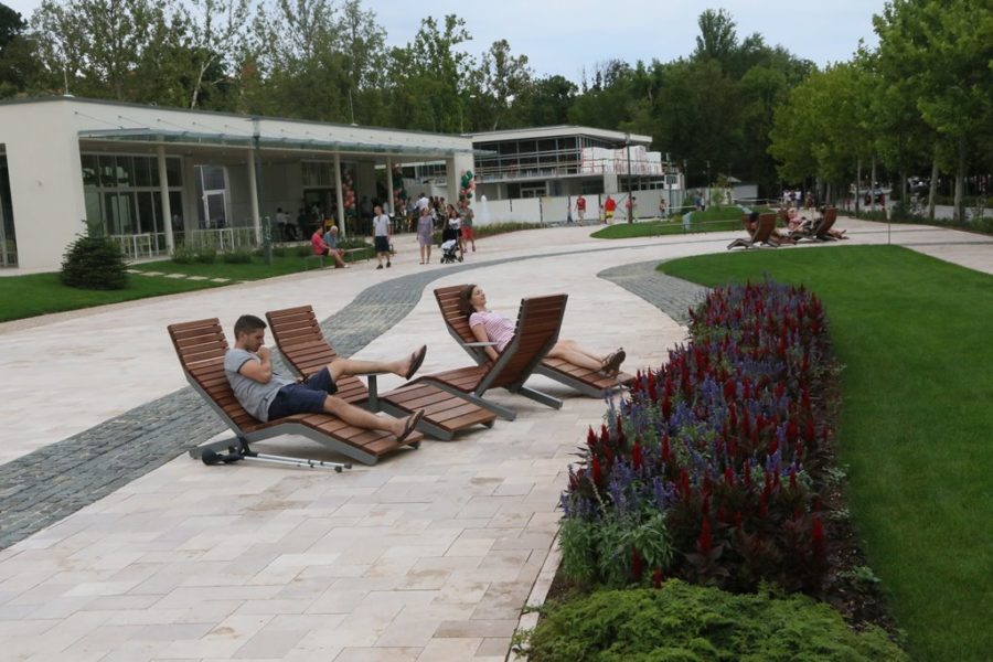 A süttői mészkő-burkolat klímabarát megoldás, mert a mészkő nem forrósodik át a nyári melegben sem. A napozófelületet az időzítővel működtethető süllyesztett párásító fúvókák is hűtik. Az esténként megvilágított párafelhő látványnak sem utolsó. Az egész tér, ahogy Balatonfüred sétányai is, családbarát, gyermekbarát és kerékpáros-barát kialakítású. A terület teljesen akadálymentesített, kerékpárosok és mozgássérültek számára végigjárható. A mélygarázs kijáratok felől az egyes kerti terek akadálymentesen megközelíthetők.