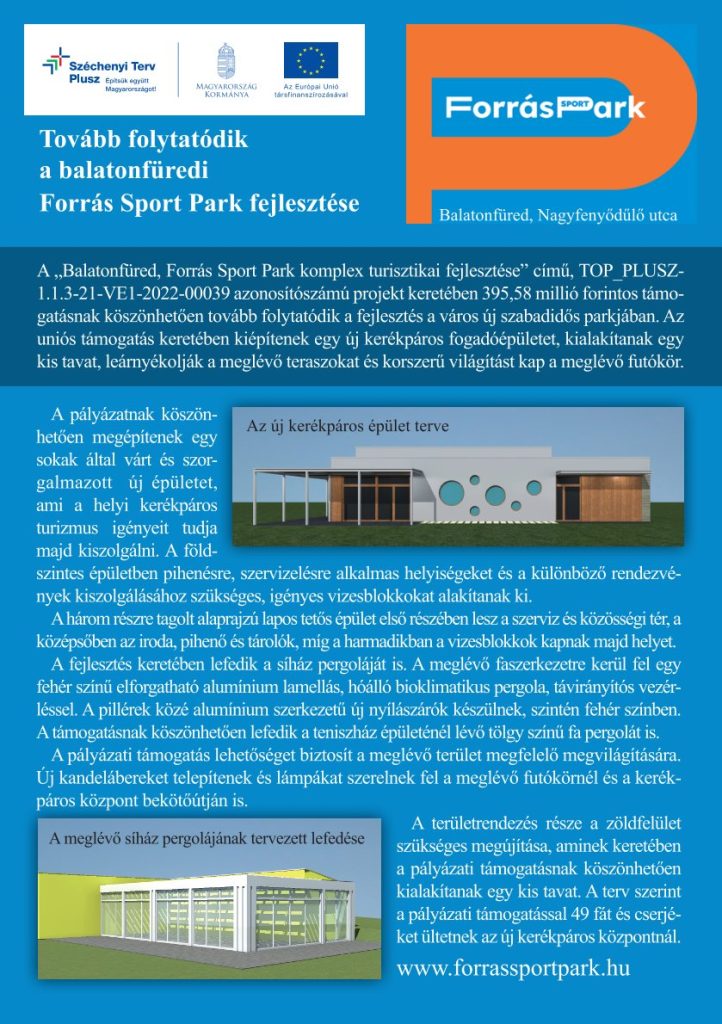 A „ Balatonfüred, Forrás Sport Park komplex turisztikai fejlesztése” című, TOP_PLUSZ-1.1.3-21-VE1-2022-00039 azonosító számú projekt keretében 395,58 millió forintos támogatásnak köszönhetően tovább folytatódik a fejlesztés a város új szabadidős parkjában. Az uniós támogatás keretében kiépítenek egy új kerékpáros fogadóépületet, kialakítanak egy kis tavat, leárnyékolják a meglévő teraszokat és korszerű világítást kap a meglévő futókör.