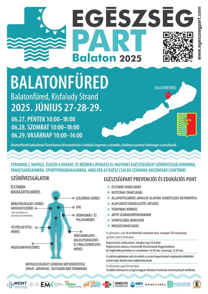 Újra Balatonfüredre érkezik az Egészségpart digitális szűrőprogram. Június 27-29. között a Kisfaludy strandon mindennap lesznek szűrések, de a mindennapi életbe beépíthető, személyre szabott életmódtanácsokat is lehet kérni. A rendezvénysorozat célja, hogy a helyi lakosok és a nyaralók számára ingyenes szűréseket biztosítson és népszerűsítse az egészségtudatos életmódot. Balatonfüredi lakosoknak a Füred kártya felmutatásával ingyenes a strandra is a belépés.