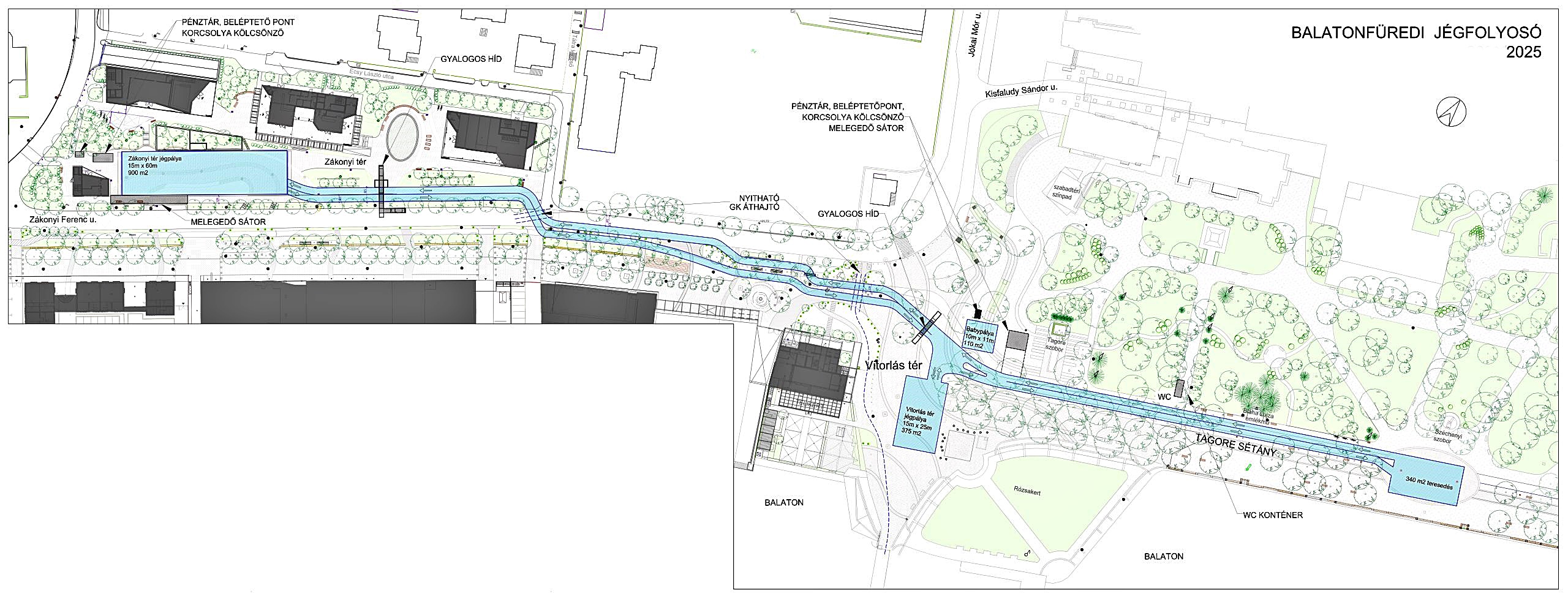 A látogatók ezúttal is 3600 négyzetméteres jégfelületen, a Zákonyi utcai jégpályától egy jégfolyosón keresztül egészen a Tagore sétányon álló Széchenyi szoborig korcsolyázhatnak el. Megépült a Vitorlás téri pálya is, itt a gyerekeknek kialakítottak egy ingyenes, külön tipegő jégpályát, a melegedő sátorban pedig mesefilmeket vetítenek majd.